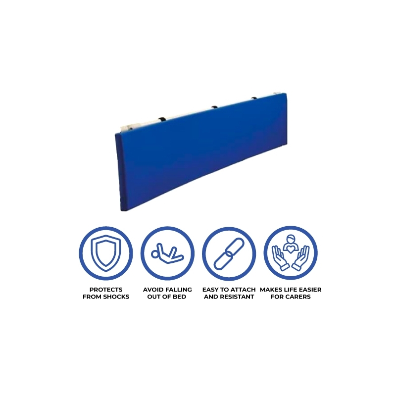 La protezione imbottita della sponda del letto impedisce al paziente di colpire le sponde del letto in legno o in metallo e previene l'intrappolamento accidentale tra le stesse sponde . Per una maggiore sicurezza della protezione delle rotaie, posizionare la parte imbottita all'interno delle rotaie quando queste sono sollevate. Le cinghie di fissaggio devono essere passate intorno alle sponde del letto e i fermi a clip devono essere agganciati.