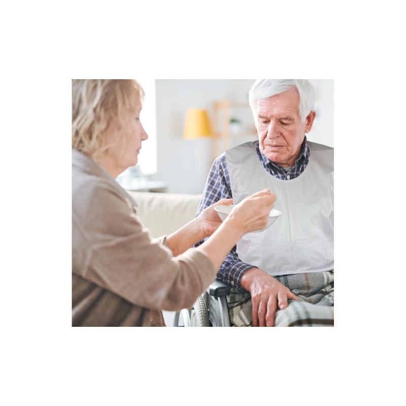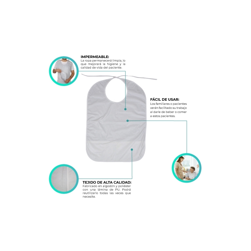 Questa pettorina per anziani è particolarmente adatta a tutte quelle persone che per qualsiasi motivo (fisico o mentale) hanno bisogno di un elemento protettivo di abbigliamento durante il processo di alimentazione o idratazione per bocca. Questo elemento proteggerà i vestiti della persona che sta sotto.