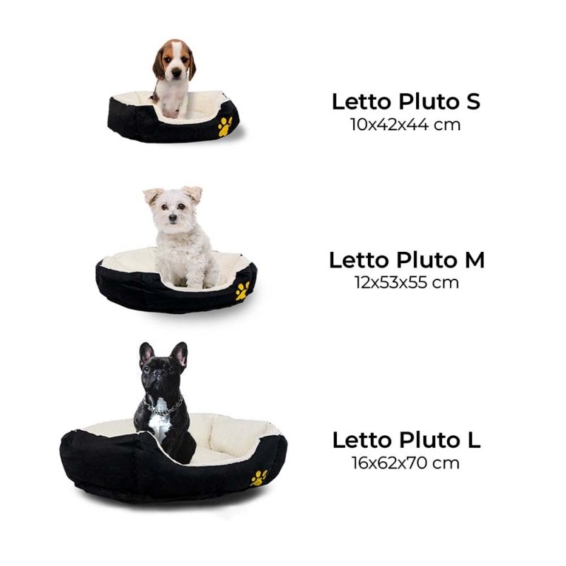 Il modello Pluto è un letto per cani caratterizzato dall'essere fatto appositamente per il riposo del vostro animale. Grazie al suo cuscino antiscivolo in poliestere nero, il lettino risulterá molto comodo e il tuo migliore amico si godrà le sue ore di sonno in un ambiente stabile e sicuro.