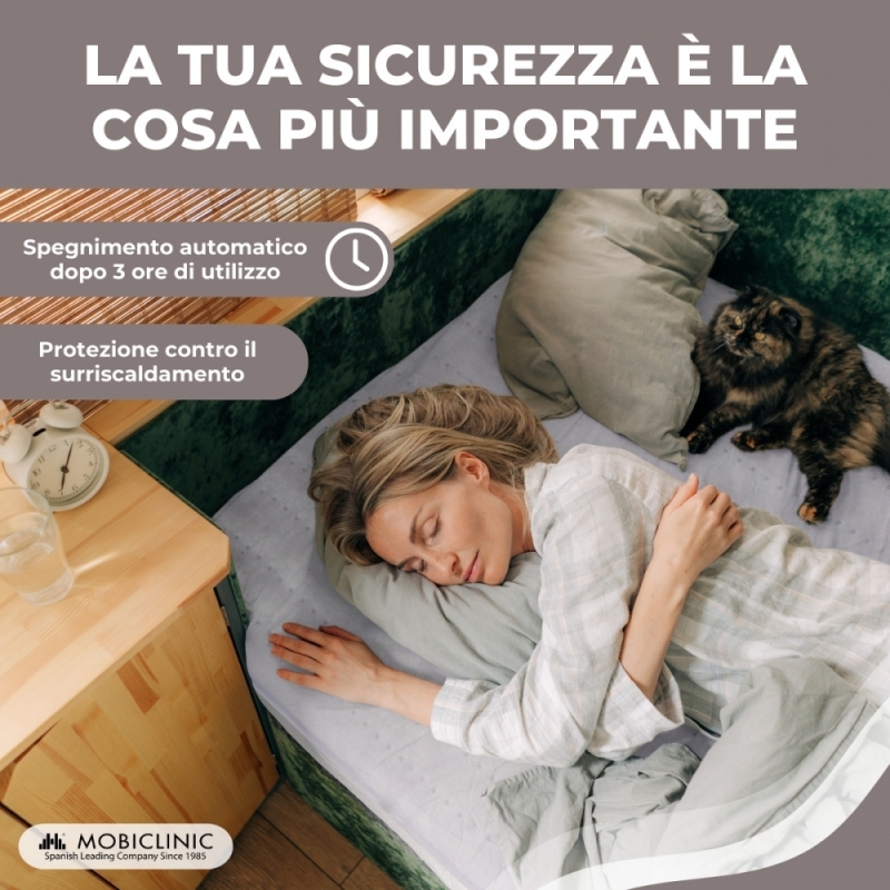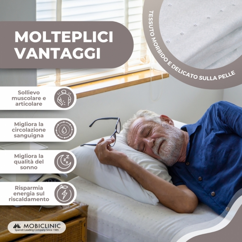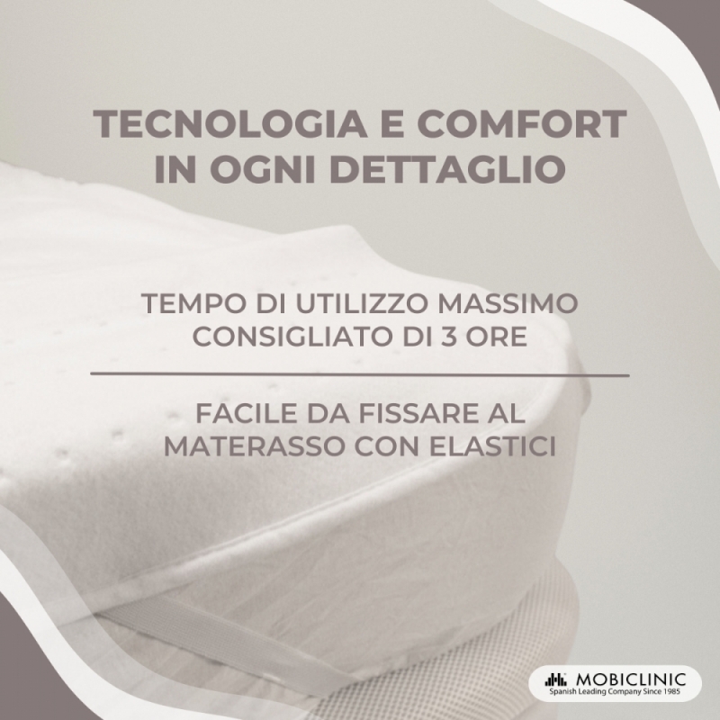 Permette di mantenere una temperatura corporea costante grazie al fatto di potercisi sdraiare sopra. Inoltre, adattandosi al materasso, offre la massima comodità, emanando un piacevole calore a basso consumo energetico.