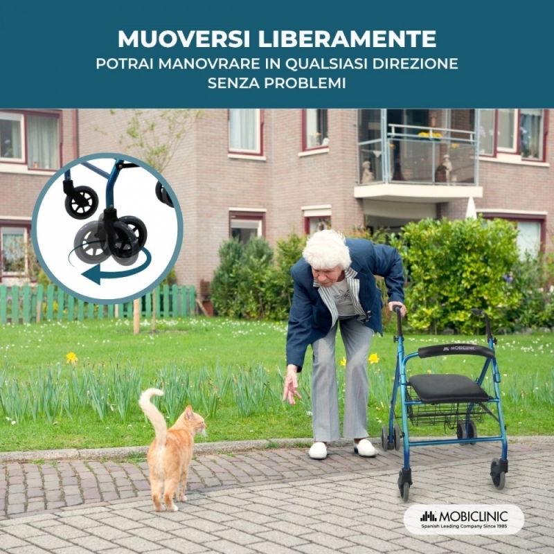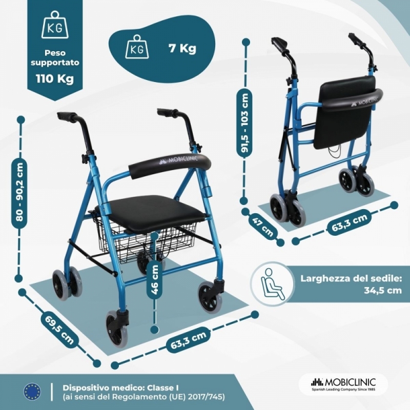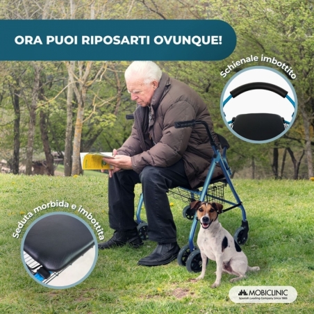 Deambulatore pieghevole | Seduta e schienale | Alluminio | Cesto | Per anziani | Blu | Prado | Mobiclinic