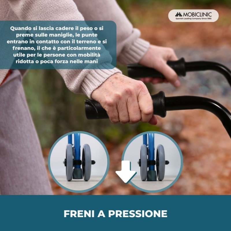 SICURO: Questo deambulatore per adulti è dotato di freni a pressione, che si attivano facilmente esercitando forza sulle maniglie del deambulatore con ruote . Questo modello aiuta a prevenire le cadute, dando all'utente grande sicurezza affinché possa muoversi con calma e acquisire autonomia e indipendenza.