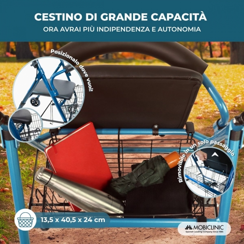 - Ha un cestino della spesa che può essere posizionato sotto il sedile o nella parte anteriore del deambulatore.