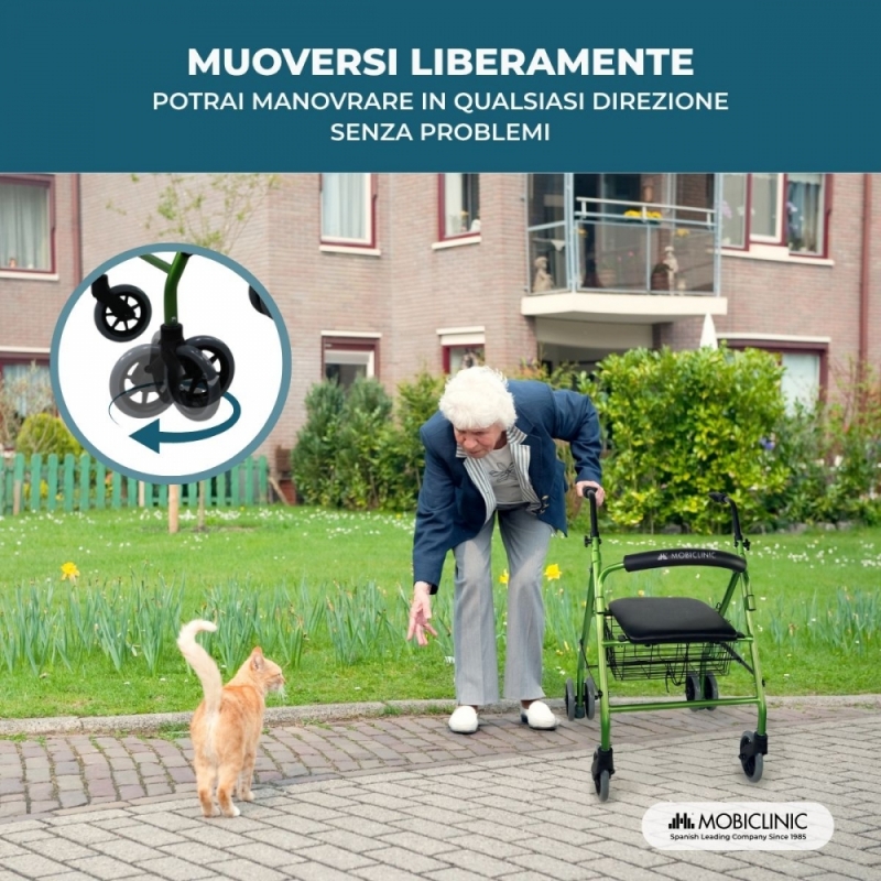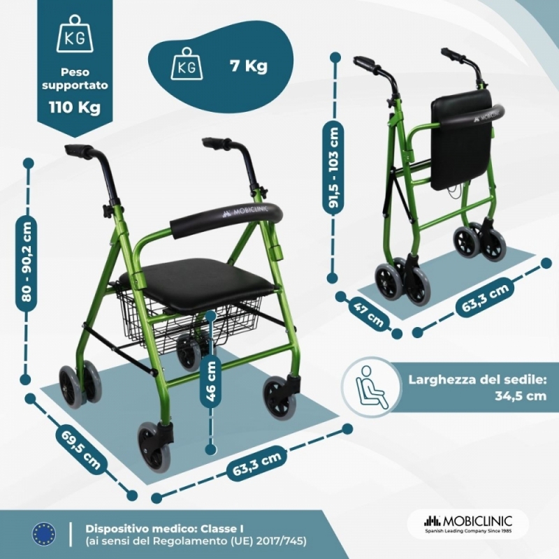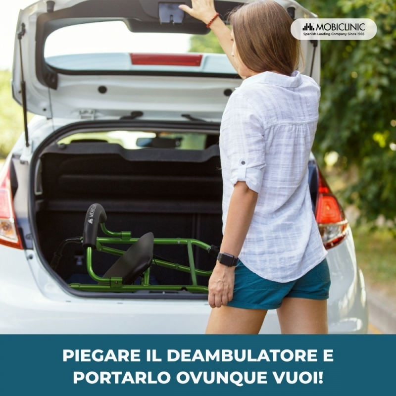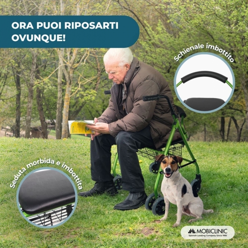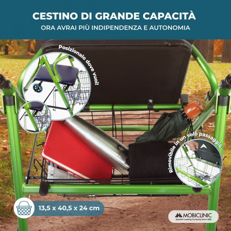 Deambulatore pieghevole | Seduta e schienale | Alluminio | Cesto | Per anziani | Verde | Prado | Mobiclinic