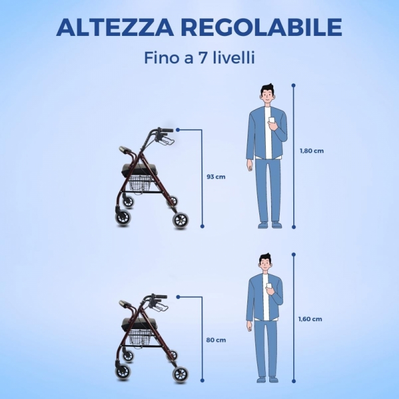 ADATTABILE : per garantire il massimo adattamento e comfort durante l'uso, questo deambulatore è regolabile in base all'altezza dell'utente. Allo stesso modo, il cuscino antidecubito si adatta perfettamente al deambulatore grazie alla presenza di 4 velcro che rendono completa la regolazione.