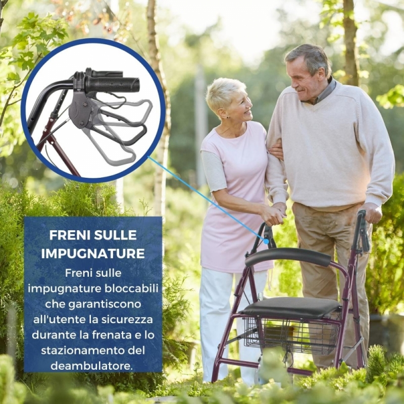 Le maniglie del deambulatore con sedile sono ergonomiche, aiutando a distribuire e ammortizzare il peso e riducendo la fatica durante l'uso. Inoltre, includono freni ad attivazione graduale per fermare il deambulatore nel momento desiderato e senza sforzo, e offrono anche la possibilità di lasciarli bloccati per garantire l'immobilizzazione del deambulatore, per esempio, quando ci si siede. Se si vuole immobilizzare completamente il deambulatore a 4 ruote, basta tirare le maniglie del freno verso il basso e le ruote verranno bloccate.