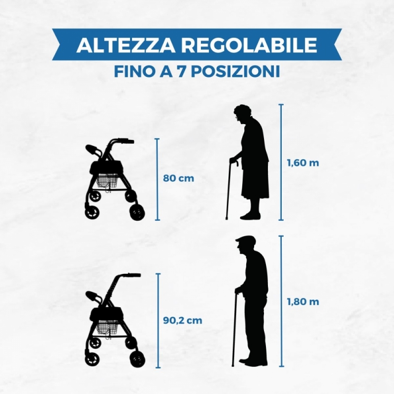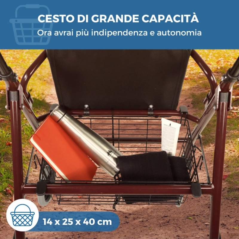 Ha un cestino della spesa che può essere posizionato sotto il sedile o nella parte anteriore del deambulatore pieghevole per anziani.