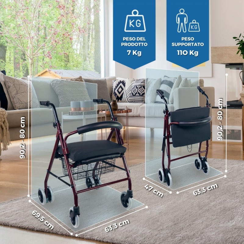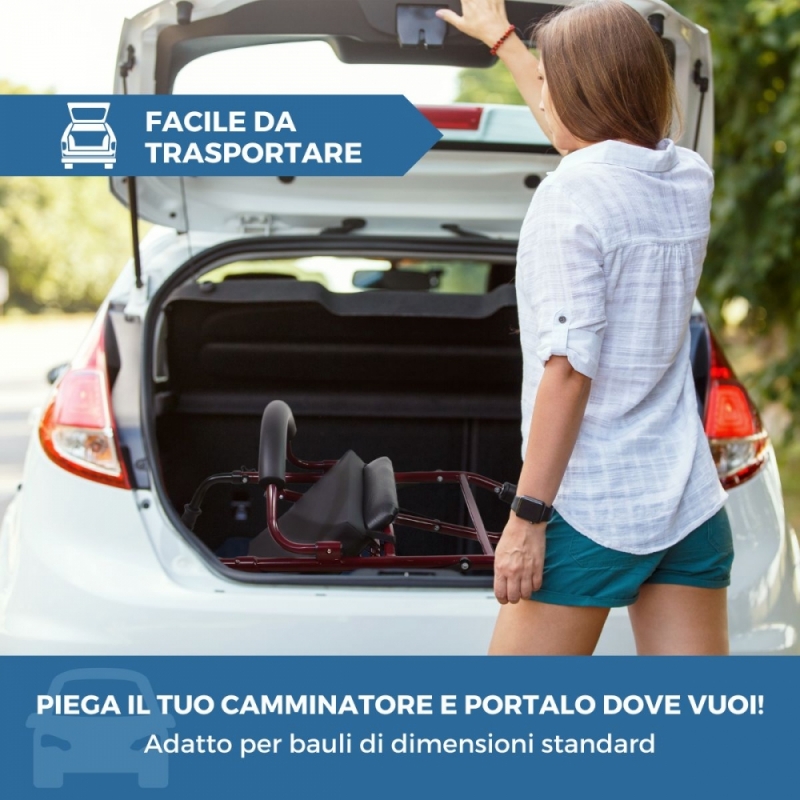 PORTE E BAULE : questo deambulatore ha una larghezza totale di 63,3 cm, quindi può passare attraverso porte di larghezza standard di 72,5 cm. Inoltre, poiché questo deambulatore piegato misura solo 47 cm, può essere trasportato nel bagagliaio di un veicolo tipo Volkswagen Polo. Assicurati delle misure delle tue porte e del tuo veicolo per verificare che si adatti a te.