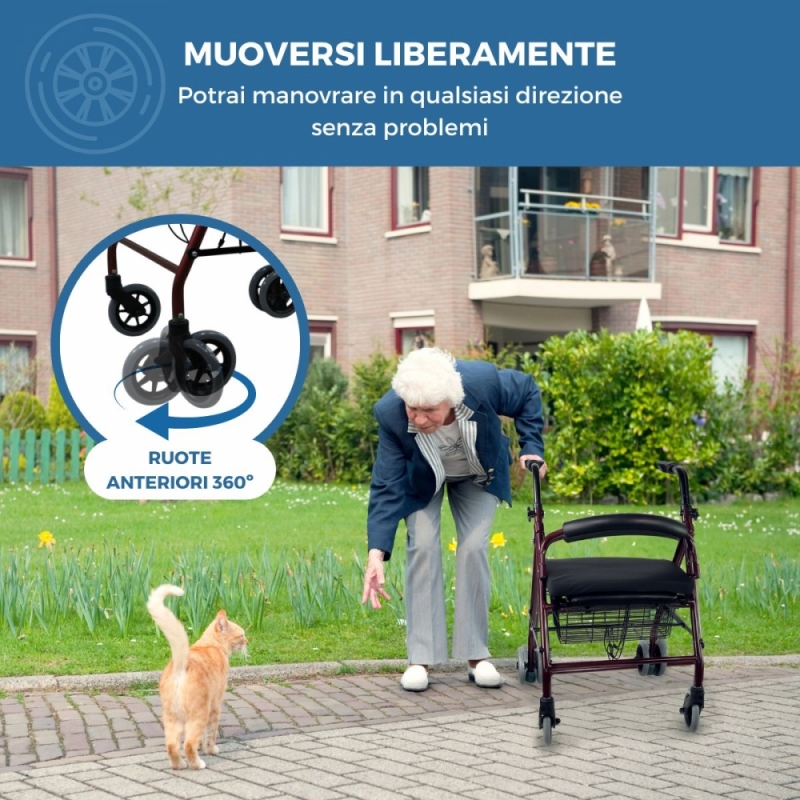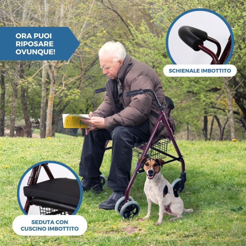 Questo incredibile pack è composto dal deambulatore Prado in bordeaux e da un cuscino antidecubito appositamente creato per girelli per anziani.