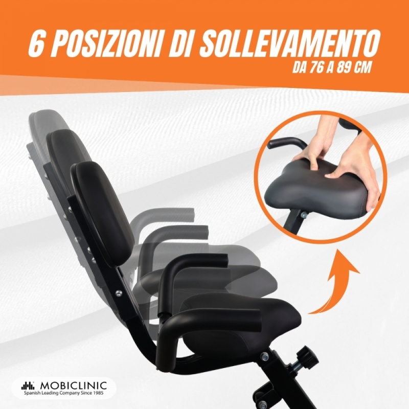 - Sedile regolabile: 6 posizioni, 76-89cm.