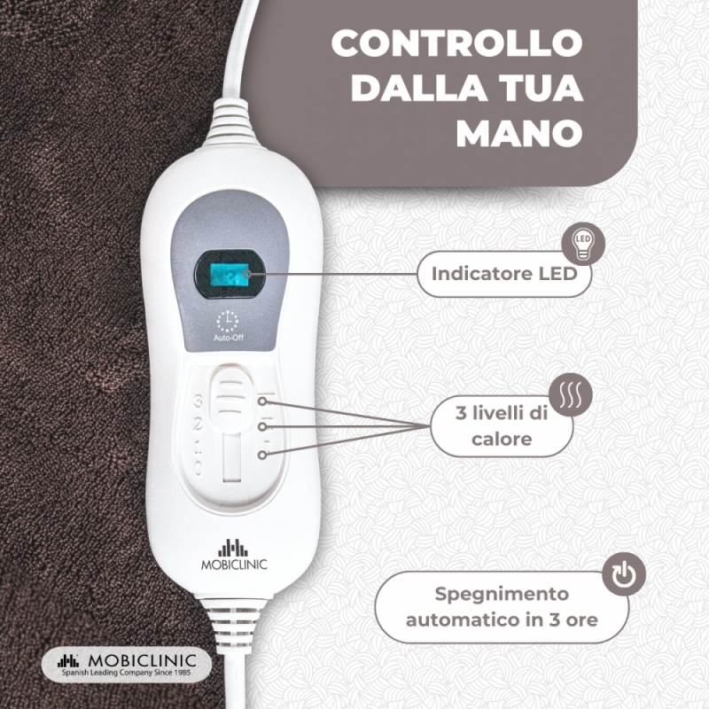 Coperta elettrica che offre un sonno tranquillo e sicuro a una temperatura piacevole e protegge dal freddo e dall'umidità. Ha una manopola di controllo digitale e la regolazione di 3 impostazioni di calore con indicatore di livello a LED. Ha una funzione di spegnimento automatico dopo circa 3 ore di funzionamento.
