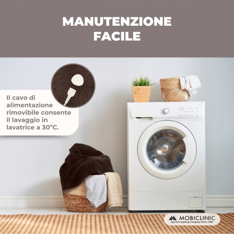 Il cavo di alimentazione rimovibile permette di lavarla in lavatrice a 30º. Si fissa facilmente al materasso per mezzo di cinghie elastiche.