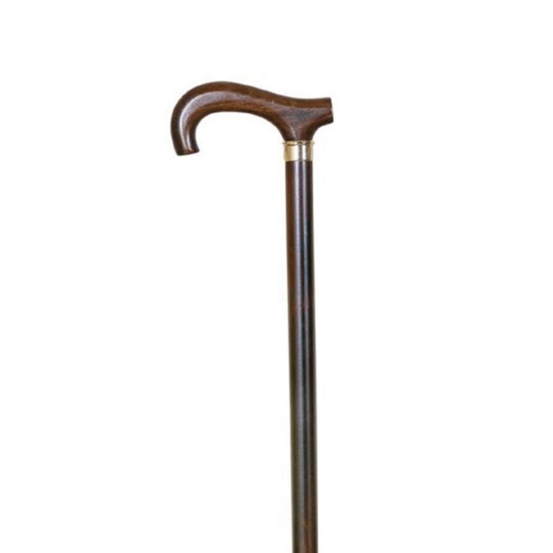 Questo bastone di colore marrone è fabbricato in faggio con impugnatura derby.