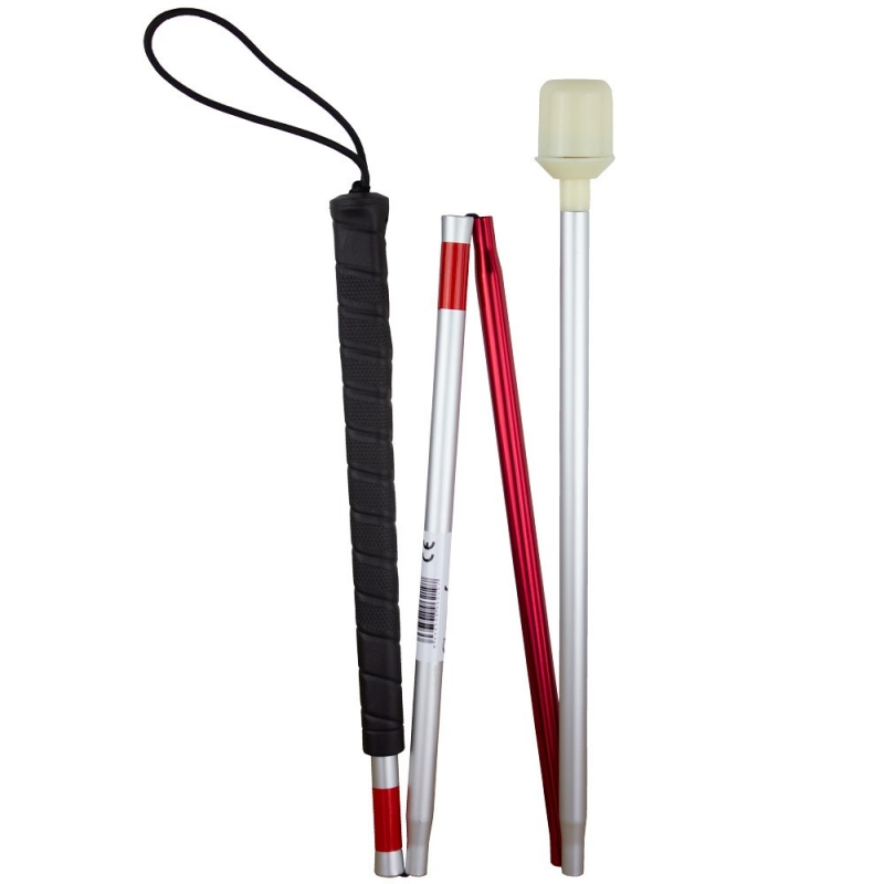Bastone pieghevole e leggero in alluminio per sordociechi. Pieghevole in quattro sezioni, ha un' impugnatura in plastica morbida con una cinghia.