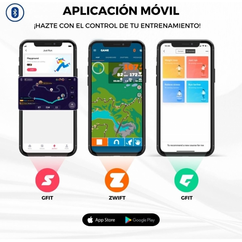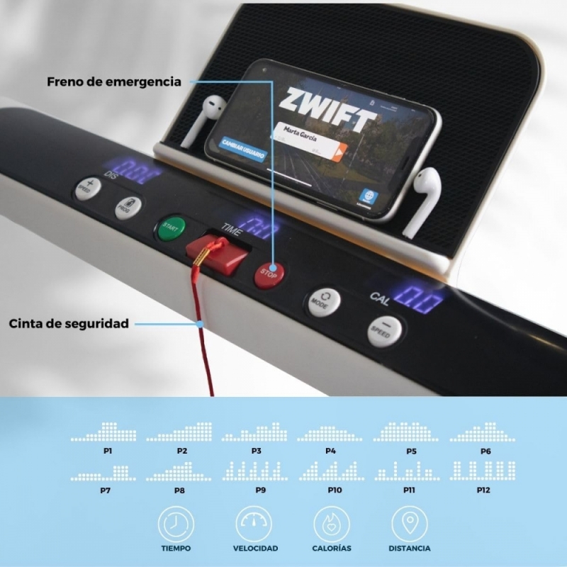 CON APP DI ALLENAMENTO: Il tapis roulant elettrico Tibet può essere collegato ad applicazioni come Gfit, Zwift e SPAX che consentono all'utente di tenere traccia dell'esercizio in modo più dinamico e divertente. Con queste applicazioni, la combinazione di divertimento e allenamento ti aiuterà a raggiungere i tuoi obiettivi insieme a una community che ti motiva ogni minuto. L'app Zwift è disponibile in inglese, francese, italiano, tedesco, spagnolo, cinese e giapponese, mentre le altre due sono disponibili solo in inglese. Allo stesso modo, il tapis roulant può essere utilizzato senza l'app proposta in quanto dispone di una barra led con 12 programmi di allenamento.