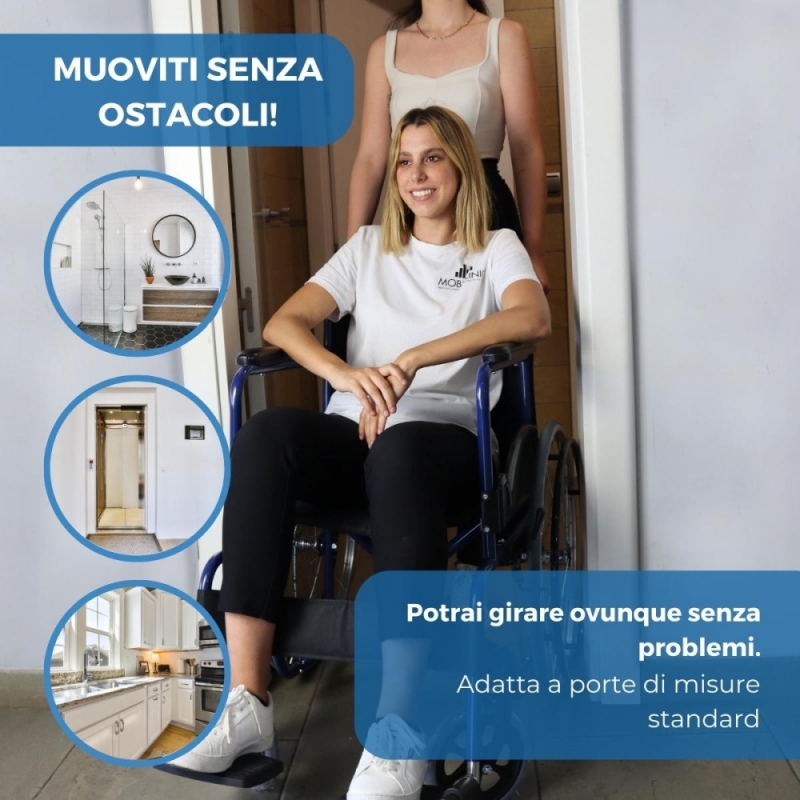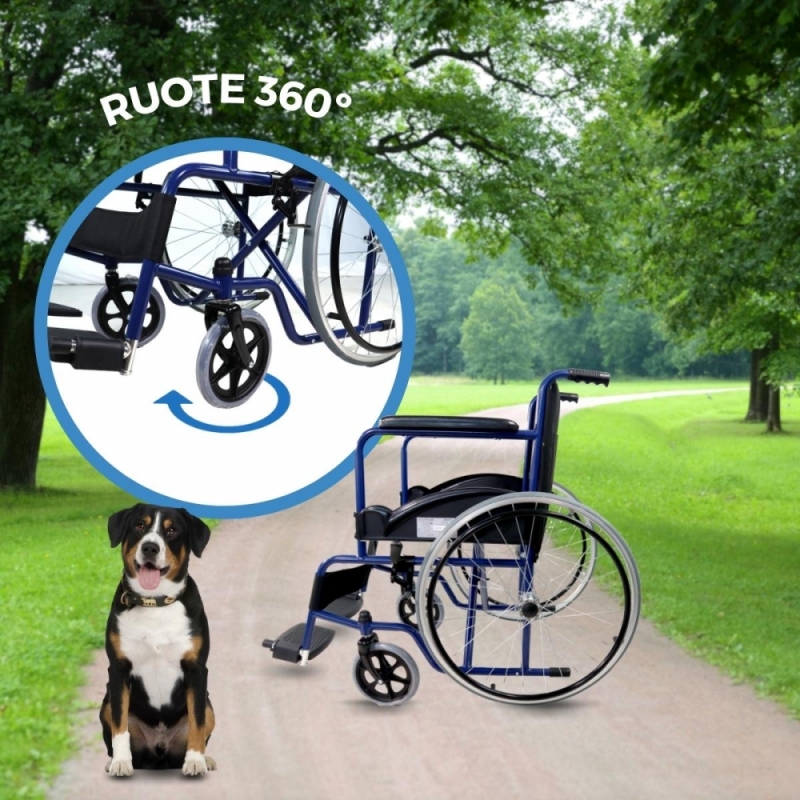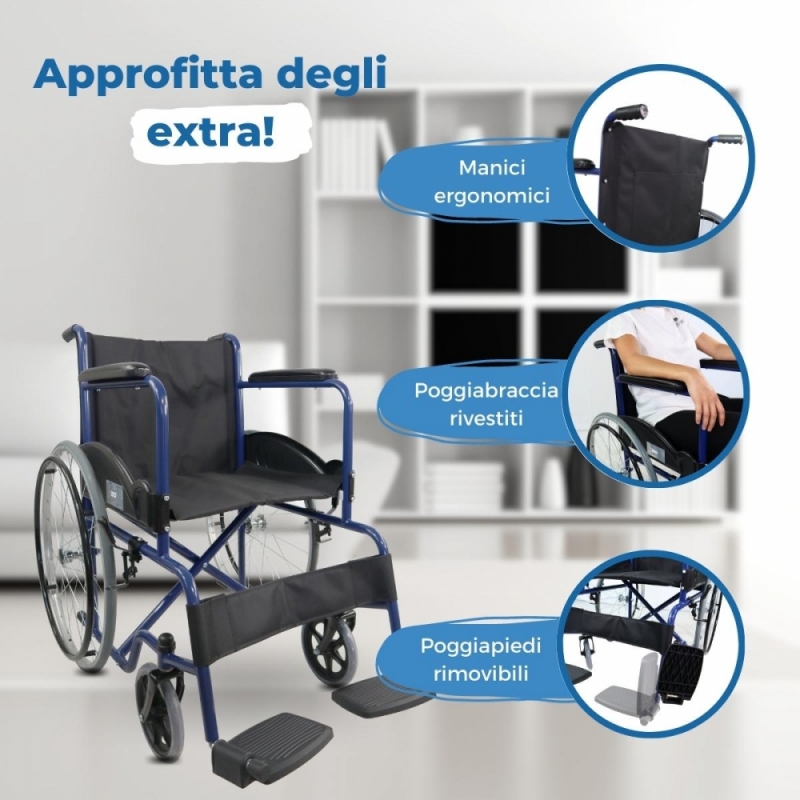 La sua seduta e lo schienale ergonomici svelano la praticità e il comfort di questa sedia a rotelle. Le ruote sono solide e non hanno bisogno di essere gonfiate, quindi sono più resistenti delle tradizionali ruote pneumatiche.