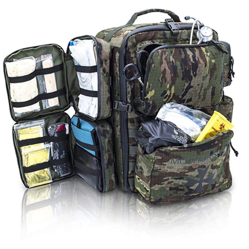 "Sviluppato in due corpi unibili, è progettato per trasportare tutte le forniture mediche necessarie per far fronte a qualsiasi emergenza militare, da un paziente con ferite lievi a interventi emorragici critici. Trasformare lo zaino SVA in un centro medico mobile completo e Caratteristiche Cerniere impermeabili Indietro pannello che permette di regolare l'altezza dello zaino Chiusure di sicurezza tipo tridente Sistema di sgancio rapido Ampolla di grande capacità fino a 124 fiale Custodia per ossigenoterapia indipendente Tasche estraibili con Sistema MOLLE"