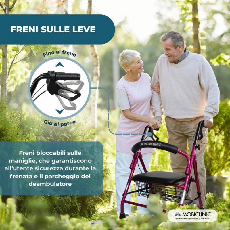 SICURO : i freni a mano e le impugnature ergonomiche si adattano, aiutando a distribuire e ammortizzare il peso durante la camminata, consentendo una migliore maneggevolezza del deambulatore.