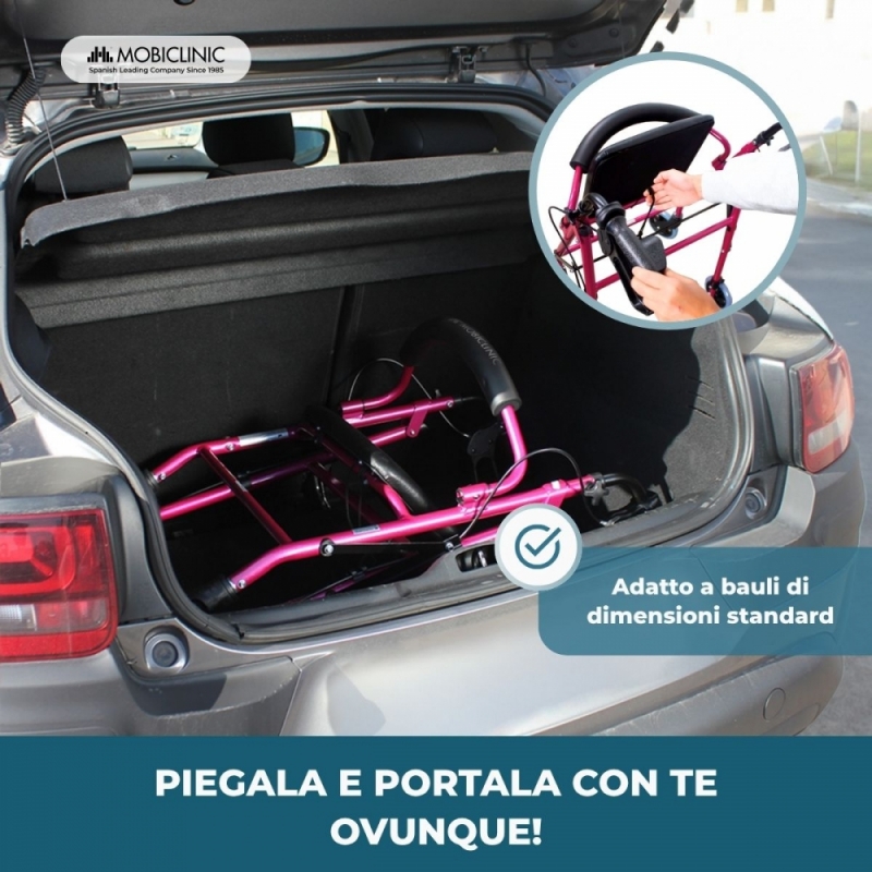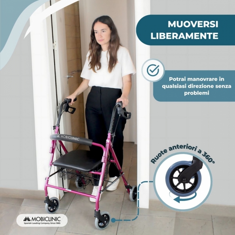 Girello per anziani | Pieghevole| Alluminio| Freni | Seduta e schienale | 4 ruote | Rosa| Escorial | Mobiclinic