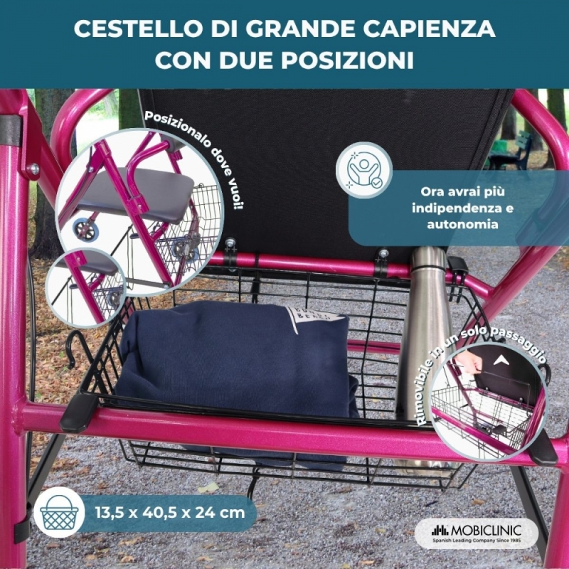 UTILE : Questo deambulatore con sedile include un pratico cestino sotto per facilitare compiti come fare la spesa o trasportare oggetti.