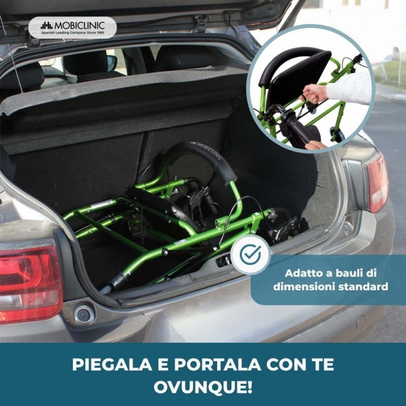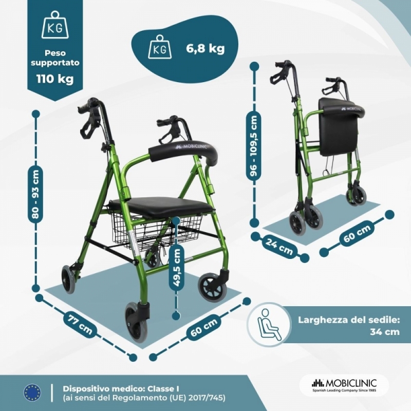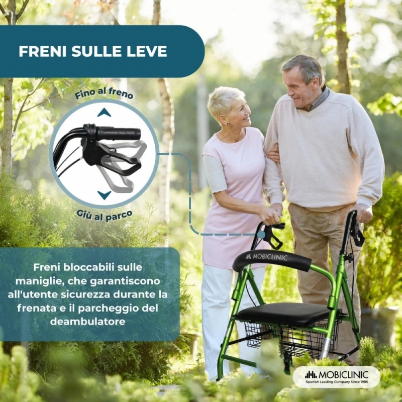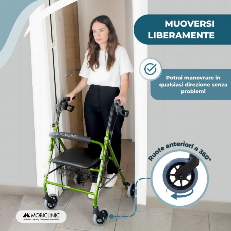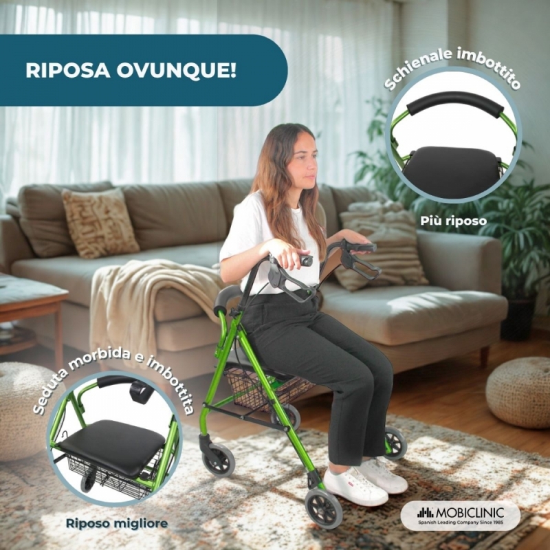 Deambulatore pieghevole| Alluminio | Freni sull'impugnatura|Seduta e schienale | 4 ruote |Verde | Escorial| Mobiclinic
