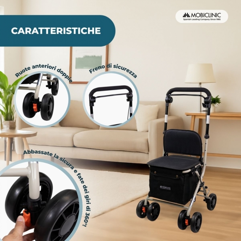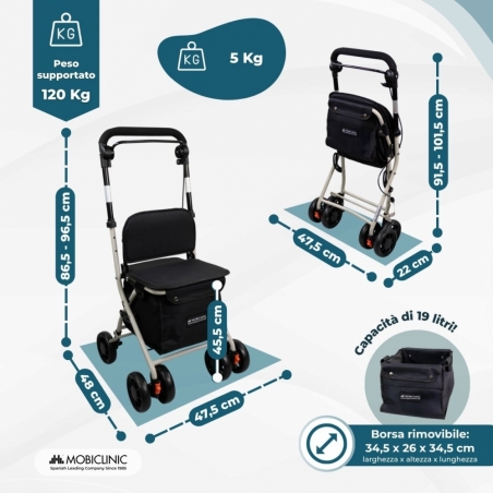 CON BORSA PER LA SPESA : Il girello per la spesa Coliseo è dotato di una borsa per riporre la spesa, rimovibile, impermeabile, lavabile e che supporta fino a 5 kg.