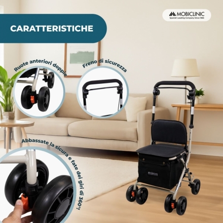 Carrello spesa deambulatore per anziani| 4 ruote | Pieghevole | Con borsa | Con freni| Nero | Coliseo | Mobiclinic