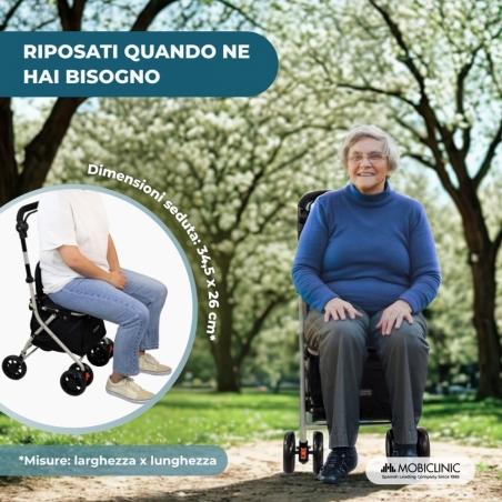 Inoltre, questo deambulatore carrello della spesa pieghevole ha un sedile imbottito, comodo e resistente per potersi riposare durante la passeggiata o mentre si aspetta nelle lunghe code al mercato. Ha anche uno schienale che permette di rilassare la schiena e una borsa della spesa rimovibile, impermeabile e lavabile che può contenere fino a 5 kg. Il carrello spesa deambulatore per anziani Coliseo è monomano, permettendo all'utente di usarlo con una sola mano mentre, per esempio, porta a spasso il nipote o il cane.