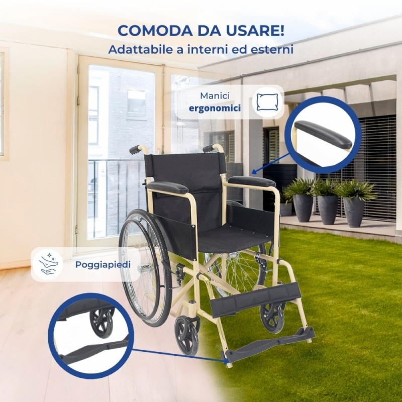 PIEGHEVOLE: sedia a rotelle pieghevole facile da riporre . Si ripiega per un facile trasporto.