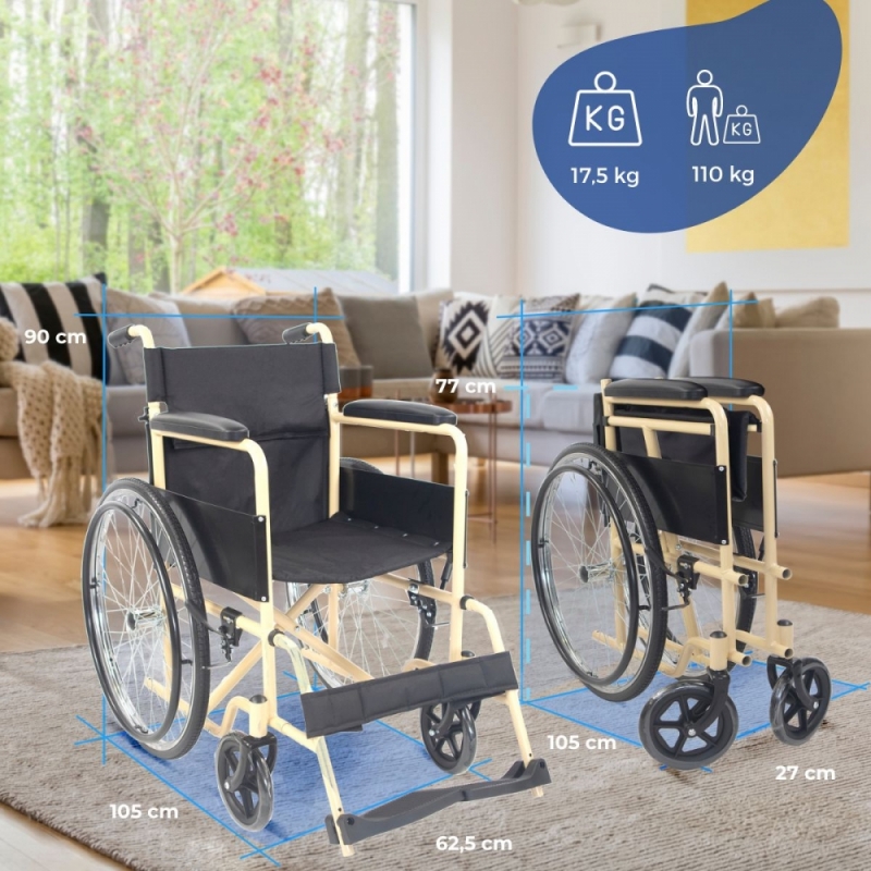 Sedia a rotelle pieghevole | Schienale diviso | Acciaio | Ruote grandi | 45 cm | Crema e nero | Denver | Mobiclinic