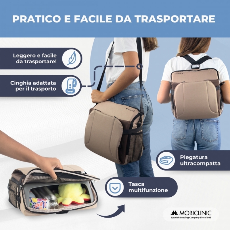 Seggiolone da viaggio con contenitore| Per neonati | Pieghevole | Tasca e maniglia | Fino 15 kg | Beige | Monkey | Mobiclinic