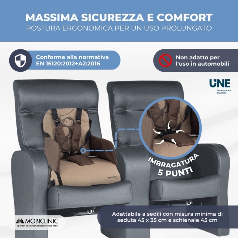 - Imbracatura a 5 punti con sistema di ritenuta toracica.