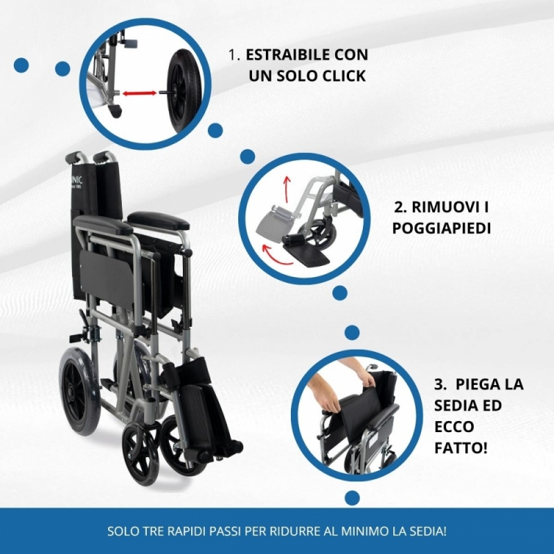 PIEGHEVOLE: sedia a rotelle pieghevole facile da riporre . Si ripiega per un facile trasporto