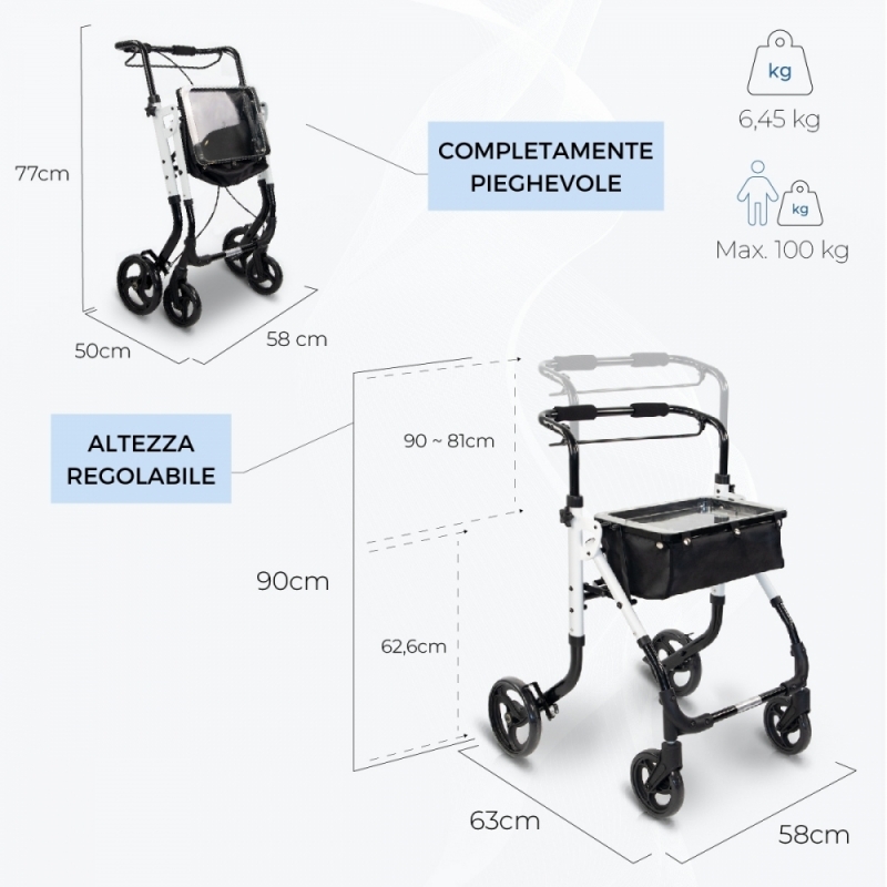 Le sue quattro ruote sono progettate per garantire la stabilità dell'utente e per superare comodamente i piccoli ostacoli sul terreno, sia in spazi interni che esterni. Offre anche grande comfort grazie alle sue maniglie ergonomiche che aiutano a distribuire e ammortizzare il peso della persona, riducendo l'affaticamento durante l'uso.