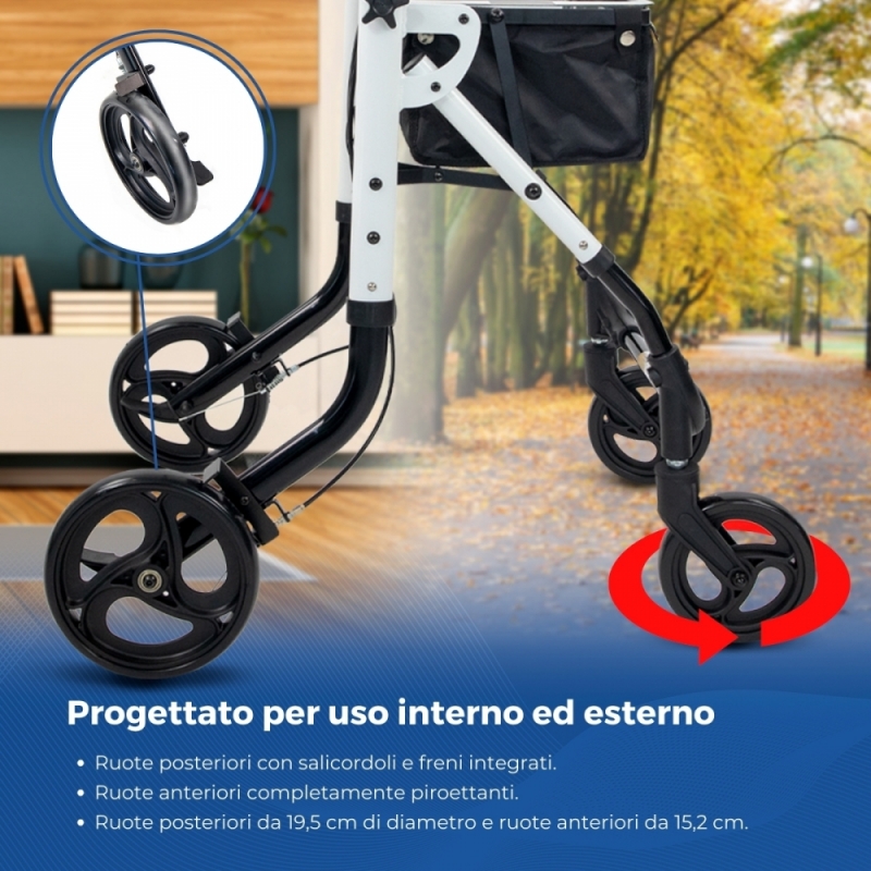 STABILITÀ : Le sue quattro ruote sono progettate per garantire la stabilità dell'utente e superare comodamente piccoli ostacoli a terra, sia all'interno che all'esterno.