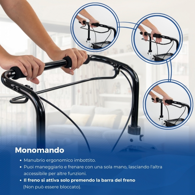 MANIGLIA A COMANDO SINGOLO: Grazie a questa funzione, il girello può essere utilizzato con una mano in momenti specifici o in momenti di necessità, come portare una piccola borsa della spesa, portare per mano un cane o un bambino.