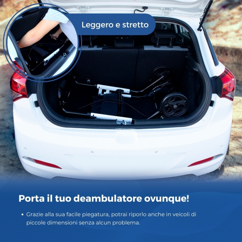 STOCCAGGIO E TRASPORTO SEMPLICI: Lo stoccaggio del deambulatore Olimpo è molto semplice, poiché essendo pieghevole , può essere riposto dove vuoi e spostato ovunque.