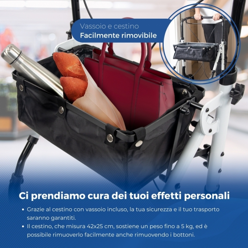 Deambulatore pieghevole per anziani in alluminio | Monocomando | Borsa e cesto| 4 ruote | Luce | Bianco | Olimpo | Mobiclinic
