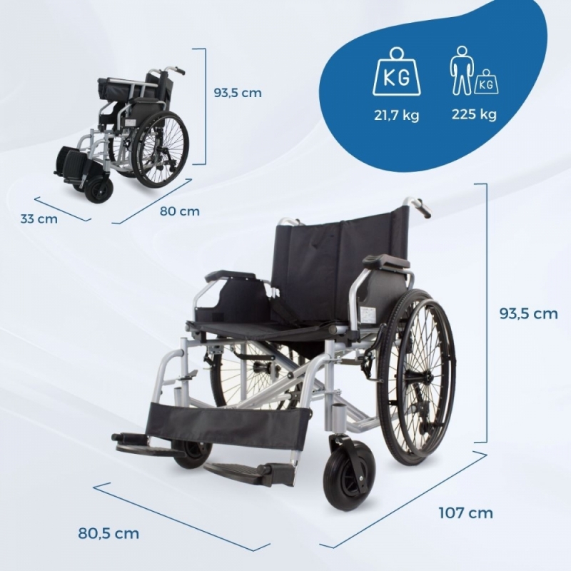 Grazie alla sua resistente struttura in acciaio formata da un telaio a doppia traversa e alle sue dimensioni maxi , la carrozzina per persone in sovrappeso è in grado di sostenere fino a 225 kg e di accogliere la sua seduta all'utente con una larghezza speciale fino a 60 cm. È anche resistente e durevole per un uso a lungo termine .