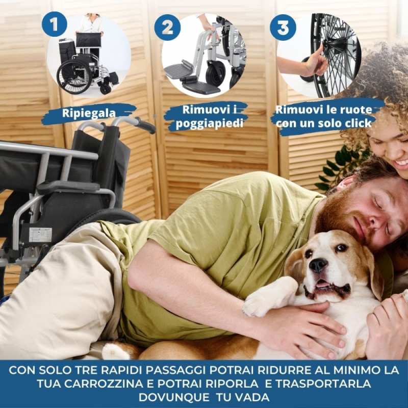 - Facile trasporto e stoccaggio grazie ai braccioli e ai poggiapiedi pieghevoli e rimovibili.