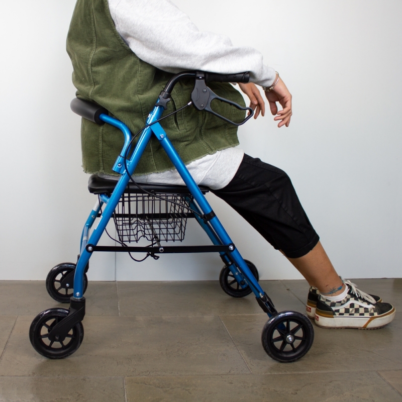 Questo deambulatore in alluminio ha un sedile e uno schienale imbottiti per garantire comfort e sicurezza, oltre a un adeguato riposo dopo lo sforzo. Include un cestino progettato per riporre i tuoi effetti personali in modo sicuro e confortevole mentre cammini. Può essere posizionato sia sotto il sedile che nella parte anteriore del deambulatore.