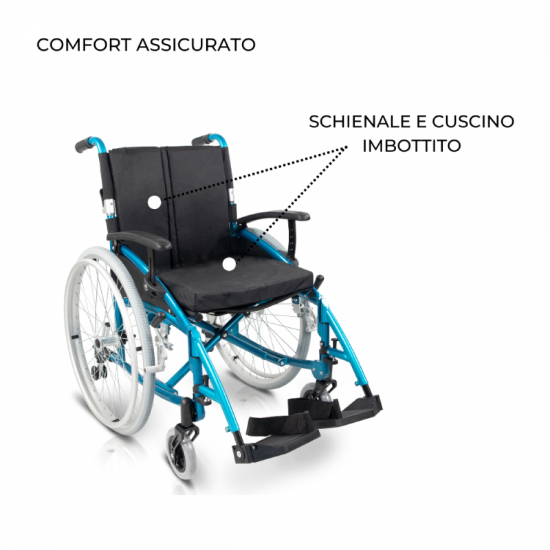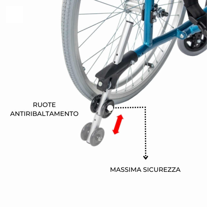 SICURO: sedia a rotelle in alluminio, che offre maggiori garanzie e maggiore durata. Ha un sistema di ruote posteriori antirollio per evitare che l'utente cada all'indietro. Include una cintura regolabile con sgancio rapido per fornire una maggiore sicurezza.