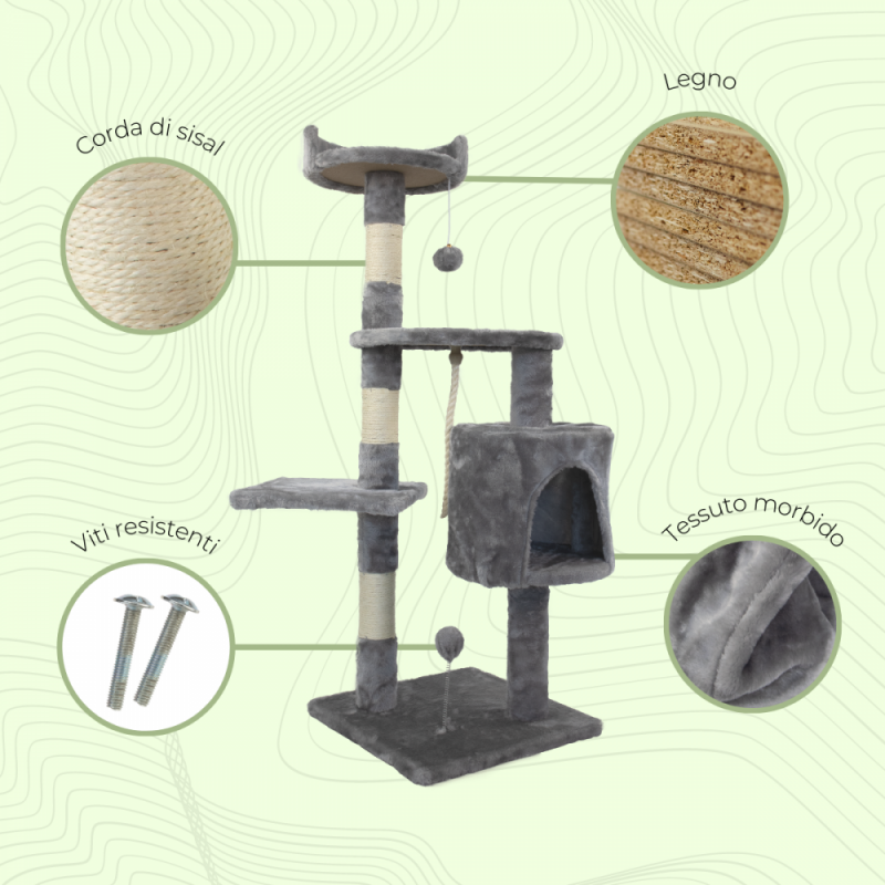 - Palle da gioco: la struttura dispone di palline per intrattenere e divertire il tuo gatto.