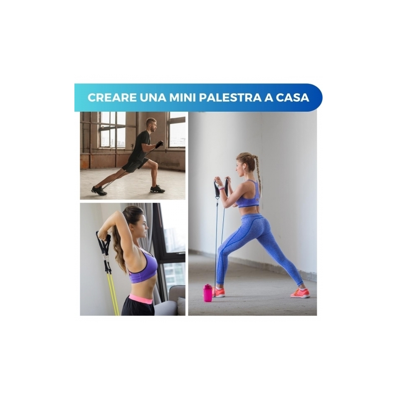 QUESTA CONFEZIONE CONTIENE: tubi elastici per migliorare la resistenza, il mini cross-trainer Veleta o movimento centrale , ideale per allenare le gambe, e una barra per trazioni con kit di installazione