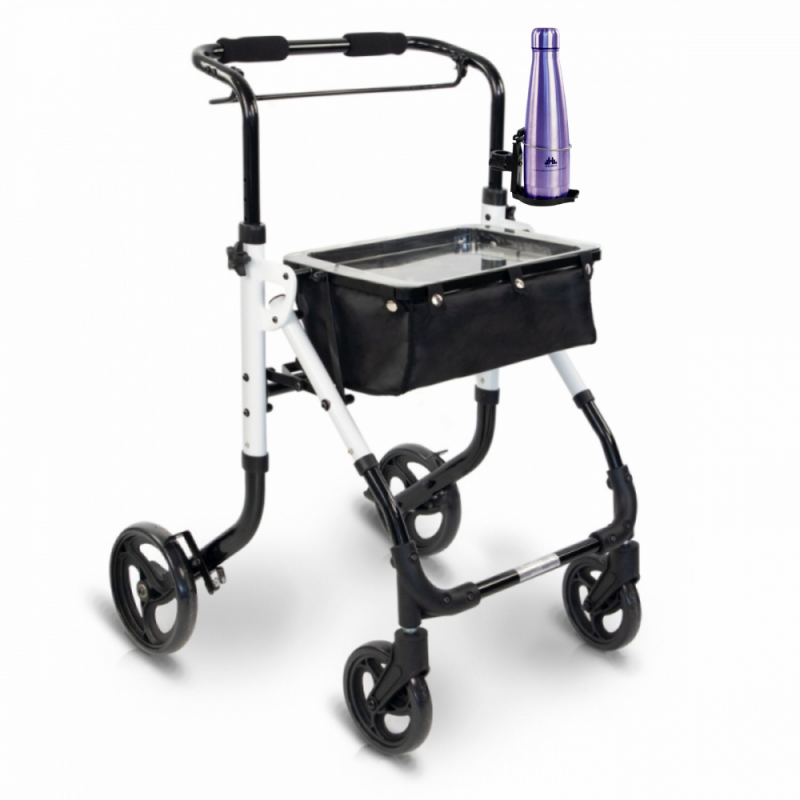- Supporto per bottiglie o bicchieri: questo strumento consente di trasportare in sicurezza tutti i tipi di bevande grazie alla sua semplice installazione. Per generare una maggiore stabilità, ha un vassoio nella parte inferiore e un anello di bloccaggio nella parte superiore. È progettato per contenere saldamente e in sicurezza qualsiasi tipo di bicchiere o bottiglia, adattandosi facilmente alla struttura del girello e con la possibilità di ripiegarsi quando non utilizzato.