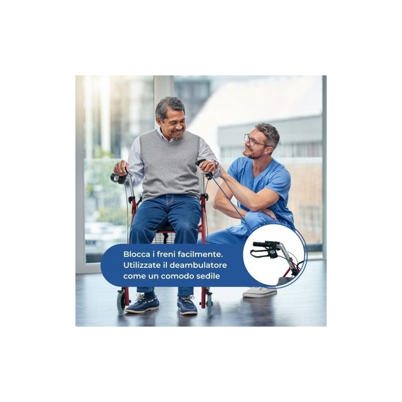 La sua impugnatura ergonomica che riduce l'affaticamento durante l'uso include freni ad attivazione dolce per fermare il deambulatore proprio nel momento desiderato e senza sforzo. Hai anche la possibilità di lasciare i freni bloccati per garantire l'immobilizzazione del deambulatore quando sei seduto o appoggiato.