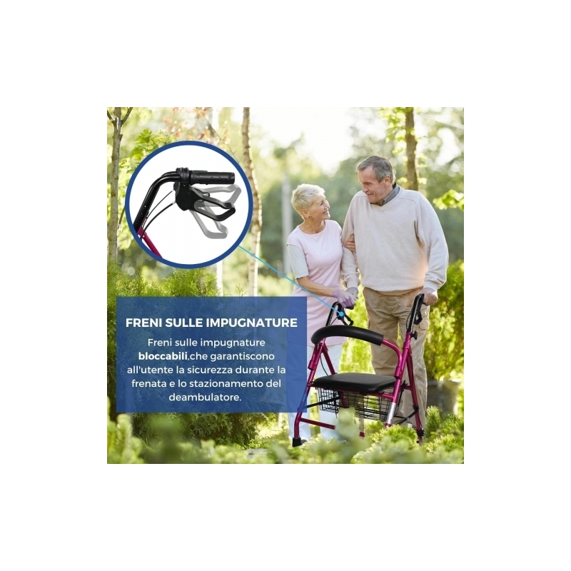 Le maniglie del girello con sedile sono ergonomiche e aiutano a distribuire e ammortizzare il peso, riducendo l'affaticamento durante l'uso. Inoltre, includono freni ad attivazione graduale per fermare il deambulatore al momento giusto e senza sforzo, sebbene offra anche la possibilità di lasciarli bloccati per garantire l'immobilizzazione del deambulatore, ad esempio, quando si è seduti sul sedile. Se il deambulatore deve essere completamente immobilizzato, le leve dei freni devono essere tirate verso il basso e le ruote saranno completamente bloccate.