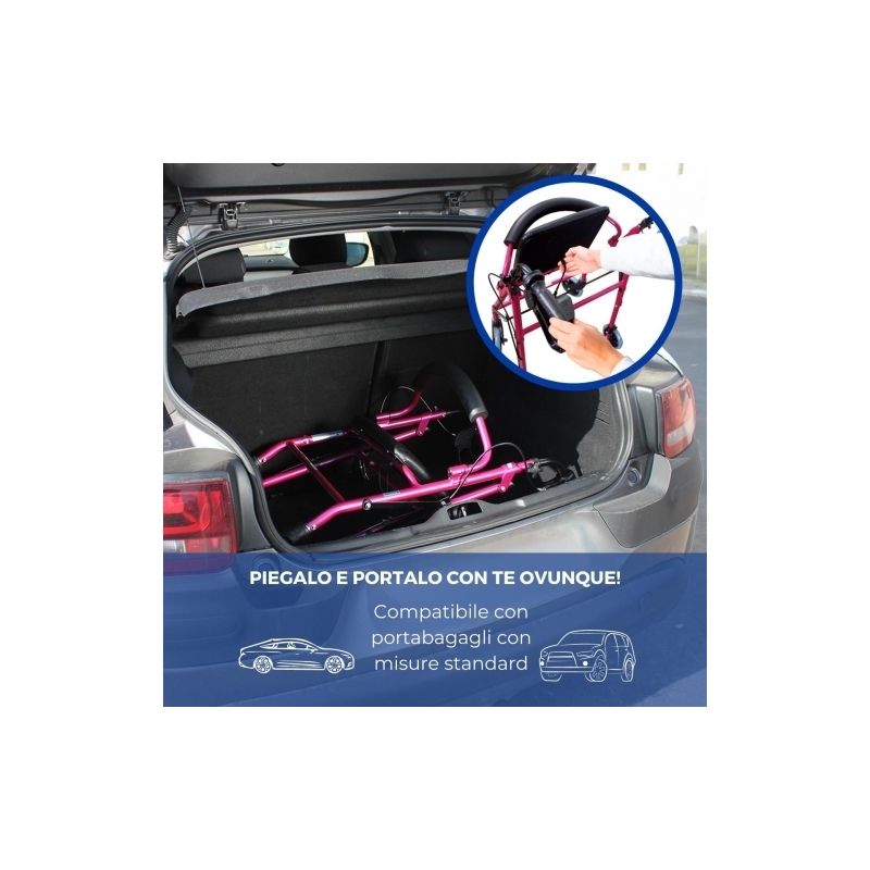 PIEGHEVOLE: questo ausilio tecnico è pieghevole, così puoi mettere senza problemi il girello per adulti nel bagagliaio della tua auto, o addirittura riporlo senza occupare troppo spazio.