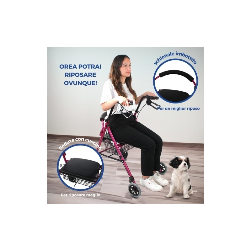 Questo deambulatore in alluminio è dotato di seduta e schienale imbottiti per garantire comfort e sicurezza, nonché un adeguato riposo dopo lo sforzo. Include un cestino progettato per riporre gli oggetti in modo sicuro e confortevole mentre cammini, potrai riporli sia sotto il sedile che nella parte anteriore del girello.