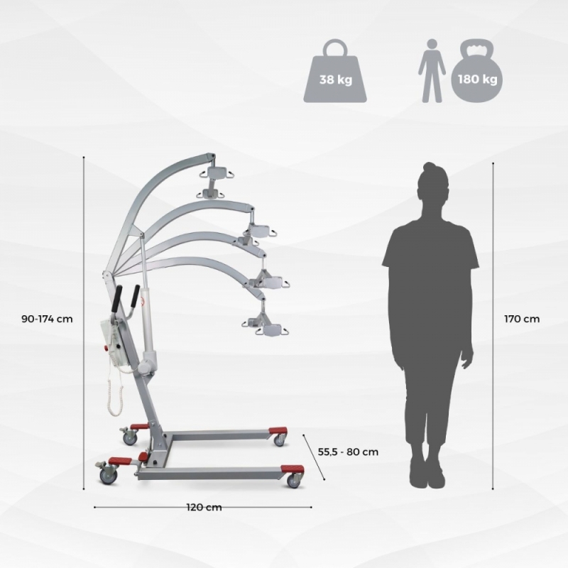 PORTATA: Questo sollevatore ortopedico supporta un peso massimo di 180 kg. La sua distanza di sollevamento è compresa tra 90 e 174 cm. Ha anche un raggio di sterzata di 127 cm, mentre il braccio ruota di circa 180°. Può scendere fino a un'altezza di circa 20-30 cm da terra.
